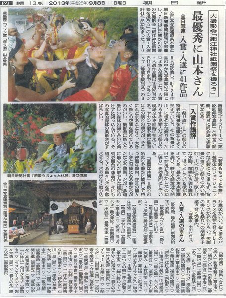 「夏の大撮影会」結果、朝日新聞に! 2013年9月15日09kenhonbu(閲覧数:556) 「夏の大撮影会」結果、朝日新聞に! 去る7月14日に開かれた大撮影会「細江神社祇園祭りを撮ろう」の入賞入選者の発表が、朝日新聞紙上に掲載されました。見逃した方も、どうぞご覧下さい。 尚、この入賞入選作品展は、第58回静岡県写真展と併展で行われます。また、細江町の地元でも開催予定です。 (事務局@)