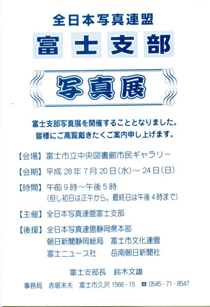 富士支部写真展 2016年7月8日09kenhonbu(閲覧数:432) 富士支部写真展会期: 平成28年7月20日(水)~24日(日)時間: 9:00~17:00 (初日は12:00~/最終日~16:00)会場: 富士市立図書館市民ギャラリー