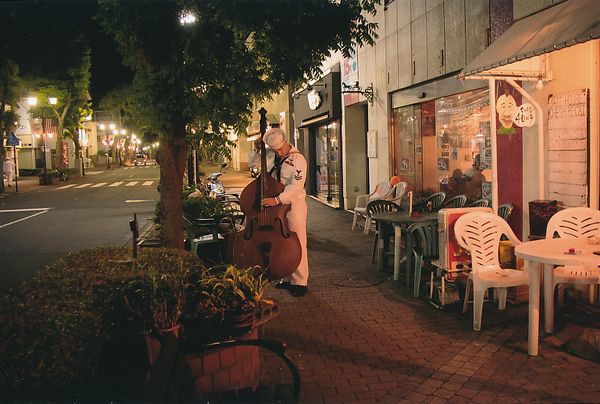 これは下田市の黒船祭の日のことですかね?多分昼間は黒船祭でざわめいていた街・下田ですね。また夜になると違った街並みに変化しております。ここはジャズバーの店先ということなんですが、人っ子一人いない、まぁ遠くの方に歩ってる人はいるけどもね、人が全くいないその中で楽器を奏でる姿、こういう情景に偶然出会ったという一つの撮影チャンスというかな、それをすかさず撮影できたのがよかったなぁ、と思います。それでこの下田とは思えない夜の街の雰囲気、これが最高の雰囲気ですね。良い情景をお撮りにになったものだなと思います。