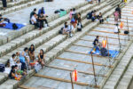 花火大会の始まりを待つ人々。①駐車場の一区画にブルーシートを広げて場所取りだろうが、こんなところで大丈夫かな? ②堤防の上に並んで、「腹ごしらえ」。まだまだ空は明るい。 ③丸々一家族?否、二家族合同だろうか?様々な人の組み合わせが面白い。描かれた人たちが全員共通の「待つ」という目的だから、すっきりと内容が伝わってくる。また、3枚の描き方にもアングル、場所、人数などに変化があり、内容の楽しい雰囲気をよく伝えている。組写真の構成を意識した撮影がなされていて見事である。やがて「始まりの一発」が上がった時の、この人たちの歓声が聞こえて来そうだ。