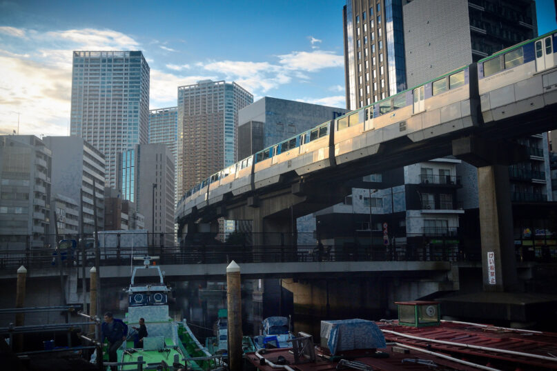 早朝、大都会の空は早くから開け、今日もまた日中の暑さを予測させている。ビルの谷間の運河はまだ仄暗く、船上に人影が動き始めている。そこに突然、その静寂な空間を破る轟音が鳴り響く…。上方に鋼鉄の塊が侵入し通り過ぎていく。ビルの合間から差し込む光が「動く塊」の側面に反射し、流れる光となり、無機的な高層ビル群の中へと突入していく。連続的な金属音も小さくなり、やがてまたこの場に静寂が戻ってくる。つかの間の夢であったかのようその一瞬を見事に切り取った作品である。