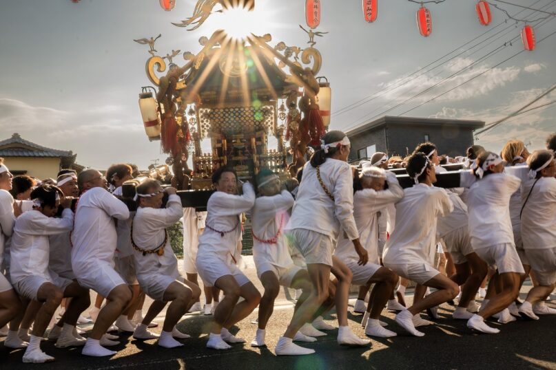 神輿の鳳凰の部分に太陽が重なり、まるで「後光の差した太陽」そのものを頭部に頂いた神輿が現れたようである。担ぎ手たちがそのことを知る由もないのだが、まるで「太陽の神輿」だと知って担いでいるかのように盛り上がり、いっそう華やいで見える。力強く神々しい感じでもある。逆光という条件を逆手に取った撮影とプリント技術から生まれた素晴らしい作品である。