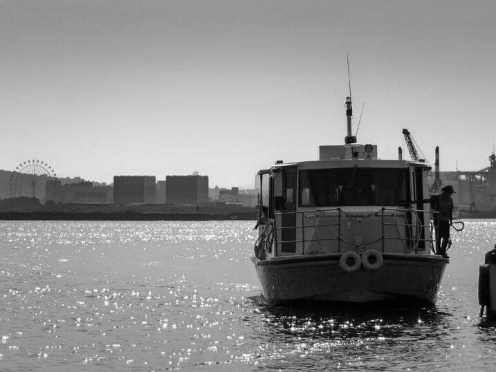 湾内を巡る観光船だろうか。船は静かに船着き場に船体を寄せ、係留ロープを持った船員が今まさに桟橋に飛び移ろうかというその場面である。ロープの輪が印象的だ。船員は女性のようでもある。海は静かに光り、遠く対岸の建物や観覧車などが霞んでみえる。無事運航を終えた安堵感のような、そして小さなイベントを終えようとする一抹の寂しさのようなものが静かに伝わってくる作品である。船を右に寄せ、人物をそっと添えるようにしたフレーミングが生きている。