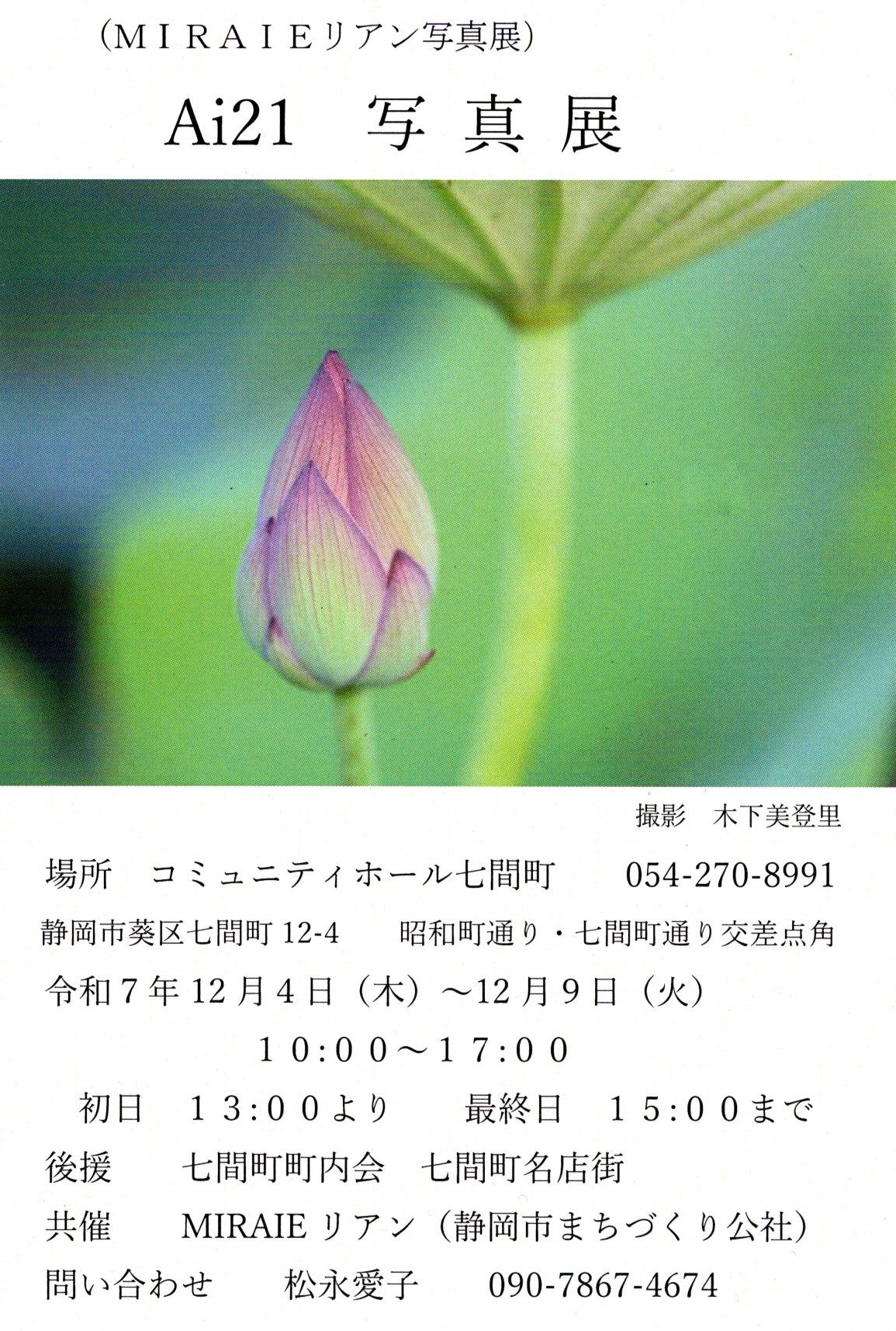 Ai21写真展のお知らせ 2025年11月6日09kenhonbu(閲覧数:118)Ai21写真展(MIRAIEリアン写真展)場所: コミュニティホール七間町 静岡市七間町12-4 昭和町通り・七間町通り交差点角日時: 2025年12月4日(木)~12月9日(火) 10:00~17:00 初日 13:00より 最終日 15:00まで後援: 七間町町内会 七間町名店街共催: MIRAIEリアン(静岡市まちづくり公社)お問合せ: 松永愛子 090-7867-4674