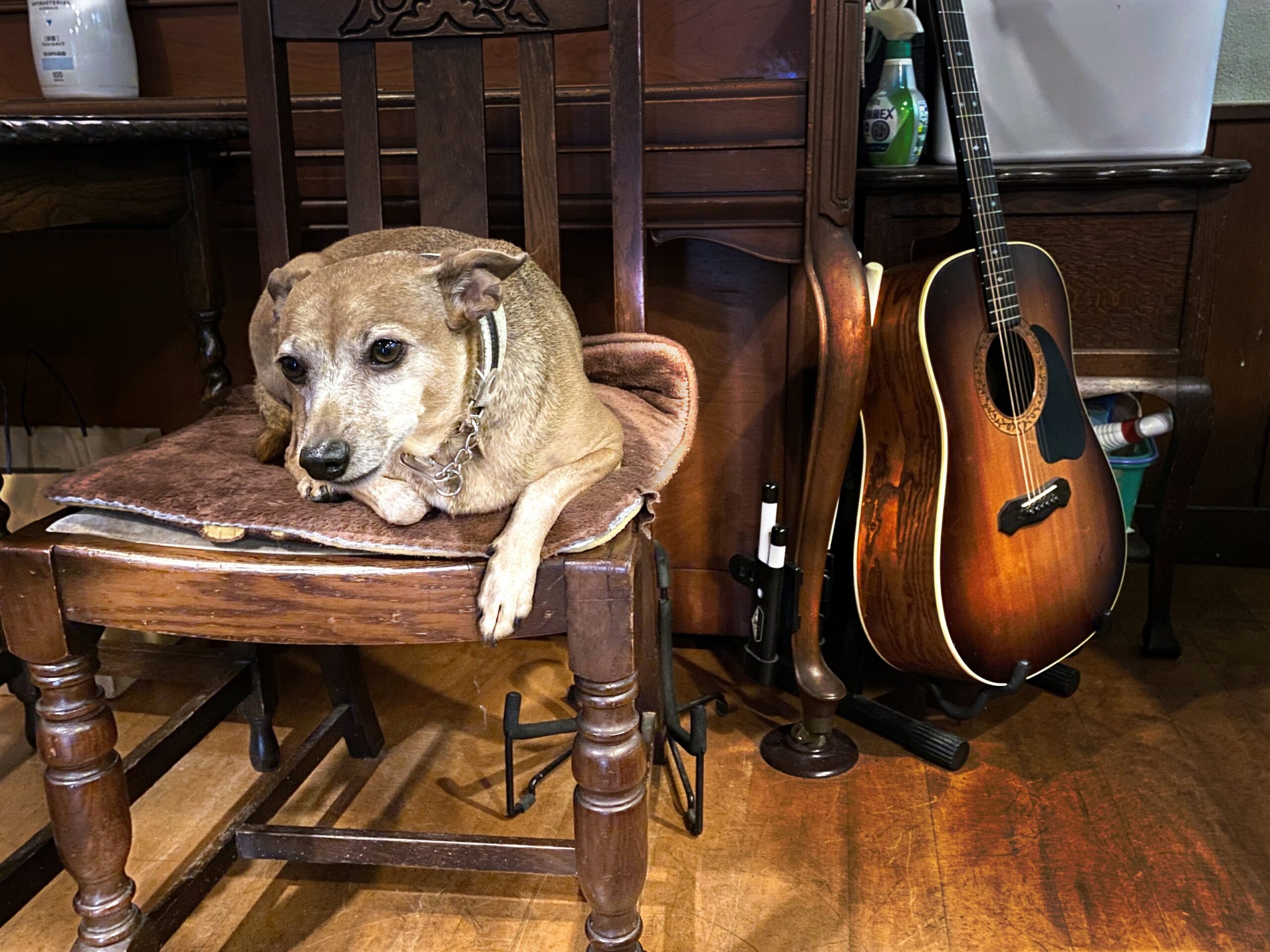 途中でオーナーは変わったものの、かれこれ30年近く前には行きつけだった、蔵を改造したレトロな喫茶店に久し振り入ってみた。カウンター席のみで、相変わらずひっそりとしていて薄暗く、落ち着いた雰囲気は変わっていなかった。コーヒーを頼んでから辺りを見回したら、何故かピアノの前の椅子に一匹の犬が鎮座してこちらを見ているのに気付いた。中型の日本犬であるがおとなしくして居るので存在感が薄い。見慣れぬ客が来たためか落ち着かぬ様子で辺りをキョロキョロ見回しているが、その仕草が何とも可愛い。長い年月をこの蔵の中で過ごしているのであろう、人間で言えば60~70歳位か?その眼差しが何ともやるせなく、哀愁を帯びた雰囲気を漂わせている。その姿態に心惹かれて、思わずスマホを取り出して何枚か撮影した。
