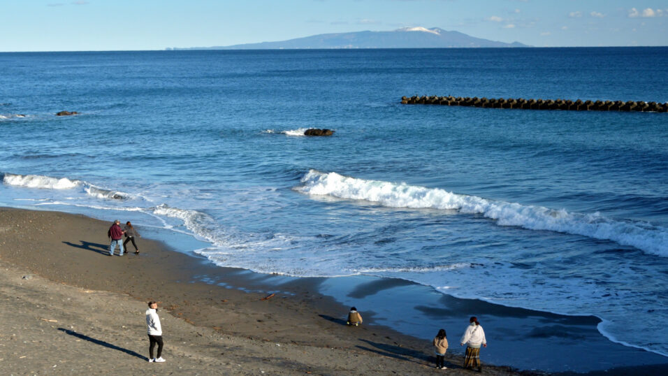 冷え込みの続く3日、雑煮やおせちで溜まった脂肪を消費すべく近くの河津浜に出かけました。普段人の姿のない浜には最後の正月休みを楽しむ帰省客らしい人たちの姿がありました。さらに、目を沖合に向けると、正月寒波の到来に、久しぶりに雪を被った伊豆大島・三原山の姿がありました。 今年が穏やかな年でありますように。