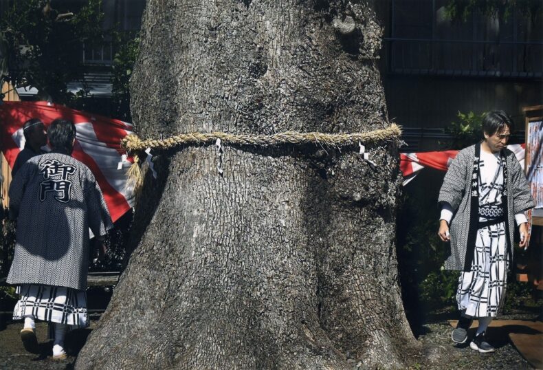ご神木を挟んで左右対称のように、紅白幕と祭り人の姿をうまくとらえて印象的な画面を作っている。二人は揃いの浴衣に法被姿。左人はその法被に丸い影を背負って奥へと向かい、右人は法被の袖を少し上げて登場。こちらは両方の親指にテープが巻かれている。「しゃぎり」を終えたばかりだろうか…。静かな境内だが祭り本番を迎え、気を張った雰囲気が伝わってくる。そして堂々と中央にあるのはご神木。光を正面から受け、その存在感が見事だ。このご神木も左の男性の影が映ることで周囲とうまく溶け込んでいる。まるで老人の横顔のようにも、また象の顔のようにも見えて親近感がわいてくる。このご神木もまた喜んでこの祭りの日を迎えている。作者の狙い通りの、いや、狙い以上の作品になったに違いない。