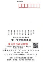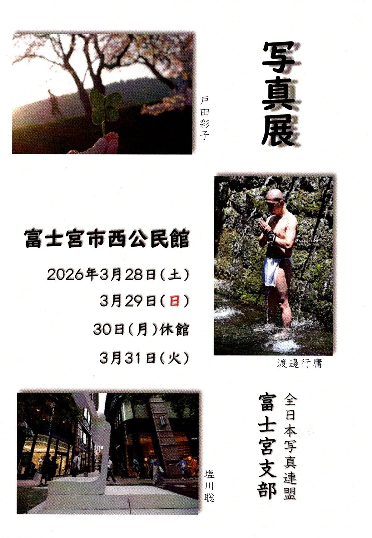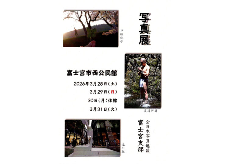 富士宮支部写真展のお知らせ 2026年1月31日09kenhonbu(閲覧数:47)第33回 全日本写真連盟 富士宮支部写真展場所: 富士宮市西公民館 富士宮市神田川町27番地の4 TEL:0544-22-3355日時: 2026年3月28日(土)~3月31日(火) 3月30日(月)休館 9:30~17:00 最終日 16:00まで連絡先: 支部長 塩川聡 090-7026-8664