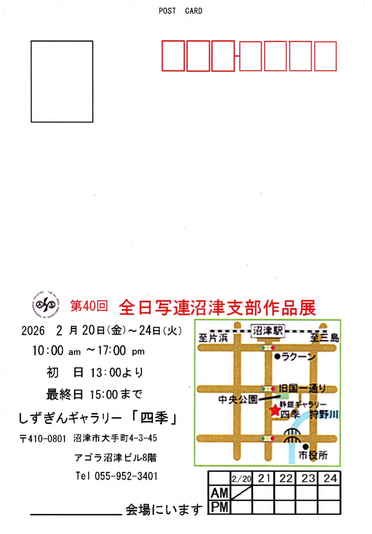 沼津支部写真展のお知らせ 2026年1月31日09kenhonbu(閲覧数:42)第40回 全日写連沼津支部作品展場所: しずぎんギャラリー「四季」 沼津 沼津市大手町4-3-45 アゴラ沼津ビル8階 TEL:055-952-3401日時: 2026年2月20日(金)~2月24日(火) 10:00~17:00 初日 13:00より 最終日 15:00まで