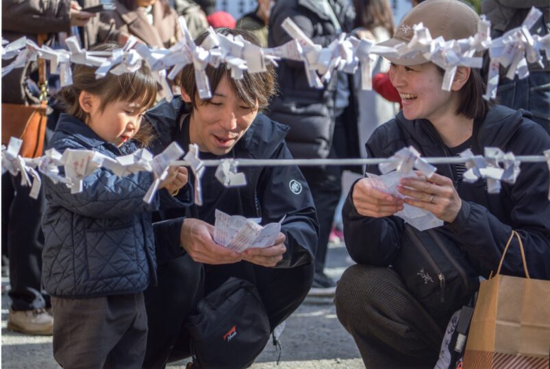 おみくじを開く姿は絶好の被写体である。だが、この作品のようにそれを正面から捉えることは至難の業である。この作品ではそれが実にうまくいっている。しかも被写体の表情が素晴らしい。この幼い子に「おみくじ」が何なのかわかるはずもないのに神妙な顔をして開こうとしている。そのすぐ横の父親は二枚もおみくじを持っている。あれ?母親も二枚だ…。二人が笑顔なわけも分かろうというもの。新年のさわやかな光が父と子の顔に差し、明るい一年のスタートになりそうだ。また、おみくじの列が3人が頭に巻いた鉢巻きのようでもあり、画面を華やかなものにしている。