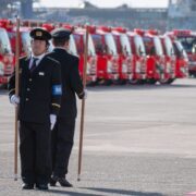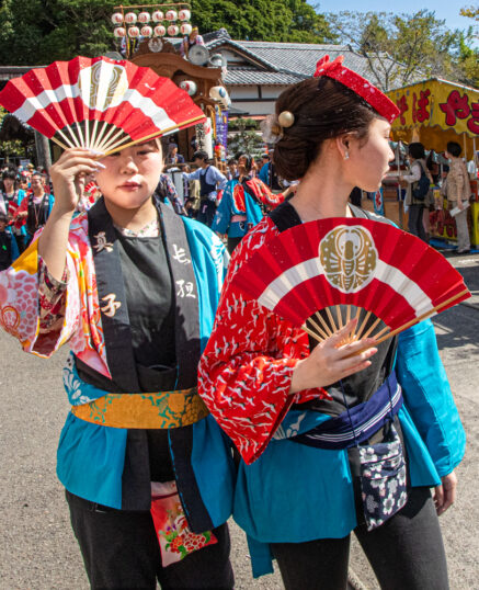 山車は一休みか…。境内を歩く法被姿の二人。撮影の了解を得て一緒に歩きながら何枚かシャッターを切った中の一枚。カメラを意識した「おすまし」のポートレートでなく、何かに惹かれて横を向いたり、扇子を日除けにしたりと、リラックスした今どきの若い子の姿をうまくとらえた親しみのある作品である。