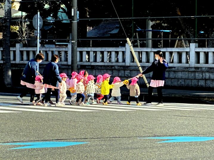 散歩途中でふと目にした光景。何時の頃からか知らないが、幼稚園児達が前後の先生方が持つロープをつかみながらの定番のお散歩風景。娘や息子、孫達の時代には無かったので、何やら不思議だし、外国人達が見たら見たらビックリ仰天するだろう。挙句、最近やたらと子供や幼児達の写真を撮る事に親達が厳しく、この時も斜め前から撮ろうと思ったら、付き添いの先生達に拒否された。これもSNSの弊害だろうし、非道な犯罪も後を絶たない何とも嫌な世の中だが、園児達の様子を見ていると思わず笑みがこぼれ、和やかで心が癒される。