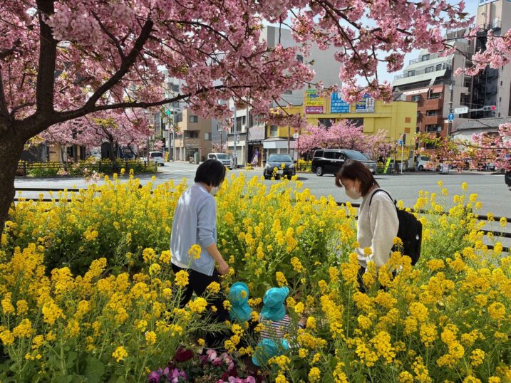 散歩途中の交差点に菜の花と、河津桜が植えられていて、毎年撮影するのが楽しみであるが、今年は先週辺りまでの寒さに河津桜の蕾はかたかったが、数日前からの異常な暑さで一気に開花して、あっという間に見頃を迎えた。十字路だから四か所で同じように菜の花と河津桜の共演となるが、その日の天候や時間帯で光の当たり方が異なり、撮影するのは結構大変。そんな状況下、何時もは撮らぬ一角に人影が見えたので近づいてみたら、なんと保育園児達が菜の花の中に埋もれていた。彼らにとっては『町角の小さな春』も、菜の花は巨大な黄色の花びらに見え、河津桜はジャングルのヤシの木の様に見えた事だろう。天候不順が続いているが、春は目の前に来ている様だ。