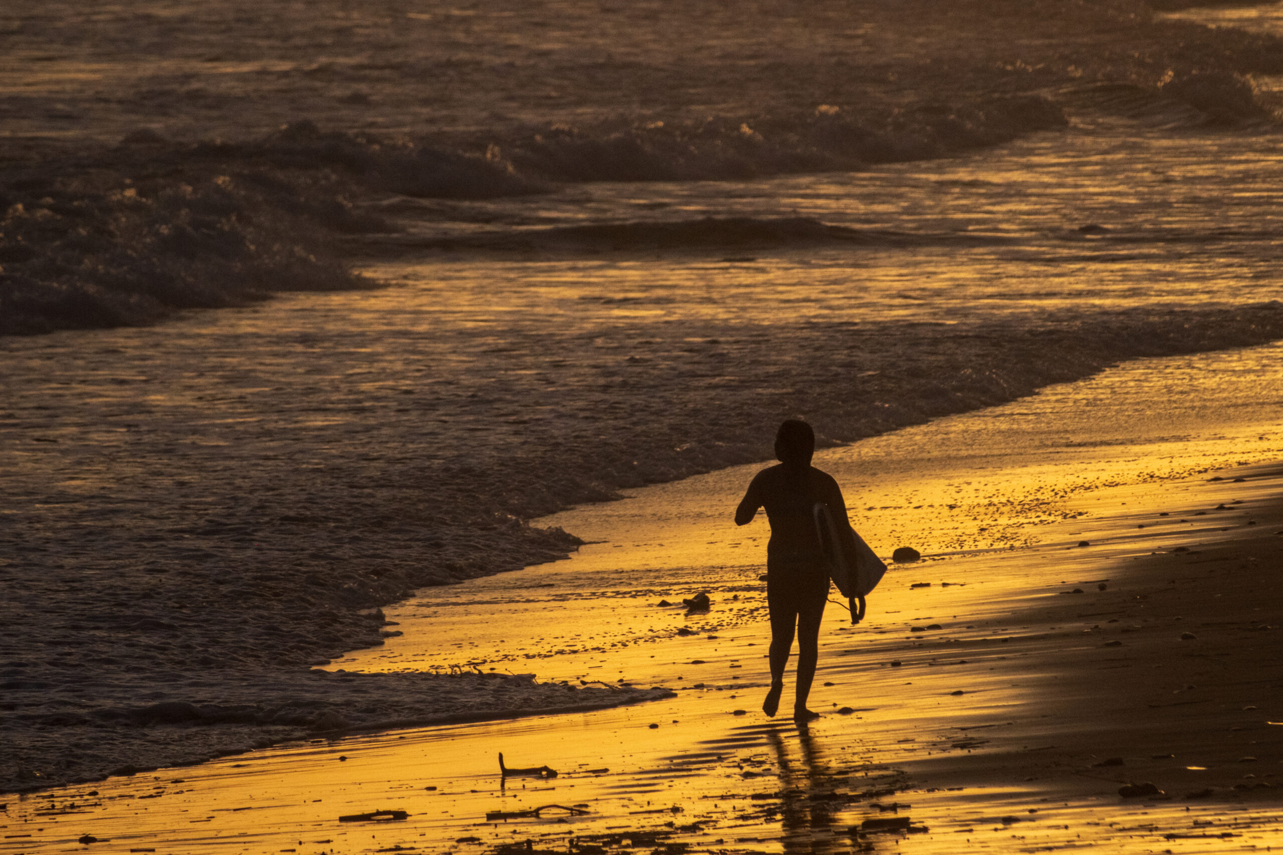 掛川支部26’4月例会 2026年4月16日09kenhonbu(閲覧数:5) 「明日へのプロローグ」 加藤洋一 選評 : 全日本写真連盟関東本部委員 小野崎 徹 作者は「夕景+人物のシルエット」月並みと思いつつ、このシーンに惚れたとコメントしています。黄金色に輝く波打ち際、外洋に面した御前崎はとても穏やかで、夕陽に向かって歩くサーファーも堂々としています。確かに惚れ惚れとする情景です。自分が惚れたシーンをきちんと作品にする技術力を感じます。