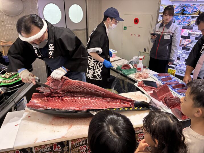 新しく開店したスパーへ出掛けてみたら、鮮魚コーナーの一角に人が溢れており、何だろうと思ってのぞいてみたら、おりしもこれからマグロの解体ショーが始まるところであった。沼津港は冷凍マグロの出荷量は県内随一で、寿司店も数多く、寿司と、干物が名物であるが、鮪の解体ショーはを見るのは珍しいので最前列の子供たちの列に紛れ込んで、暫く漁師さんの口上と、見事な包丁さばきに感心しながら見学。沼津港に上がらるクロマグロはとても大間のクロマグロの様に巨大ではないし、生きても居ないから迫力には欠けるが、それでも子供達は目を大きく見開き手を叩いて喜んでいた。
